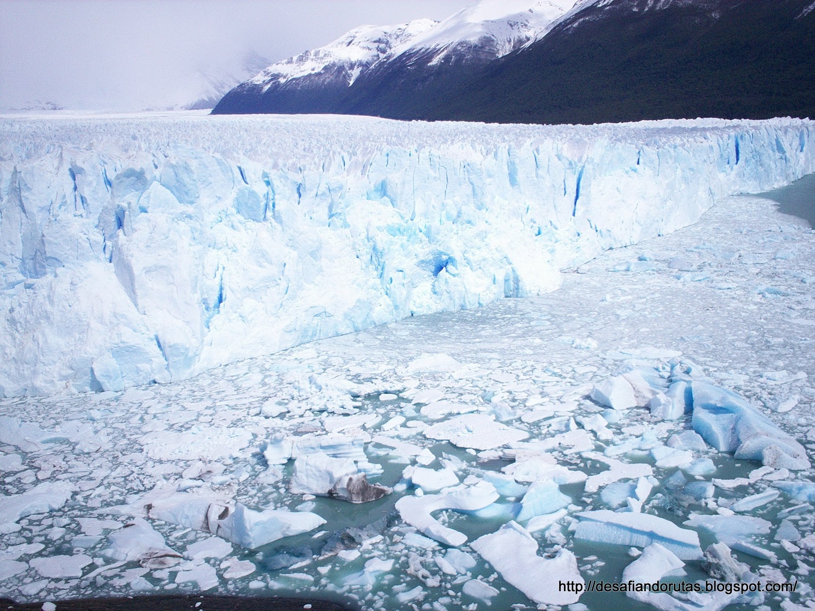 Sin embargo nada opaca el colorido especial de los trozos de hielo que flotan dando tonos desde el blanco intenso al azul profundo con toques aguamarinas y turquesas. Las manchas oscuras en el centro son morenas frontales